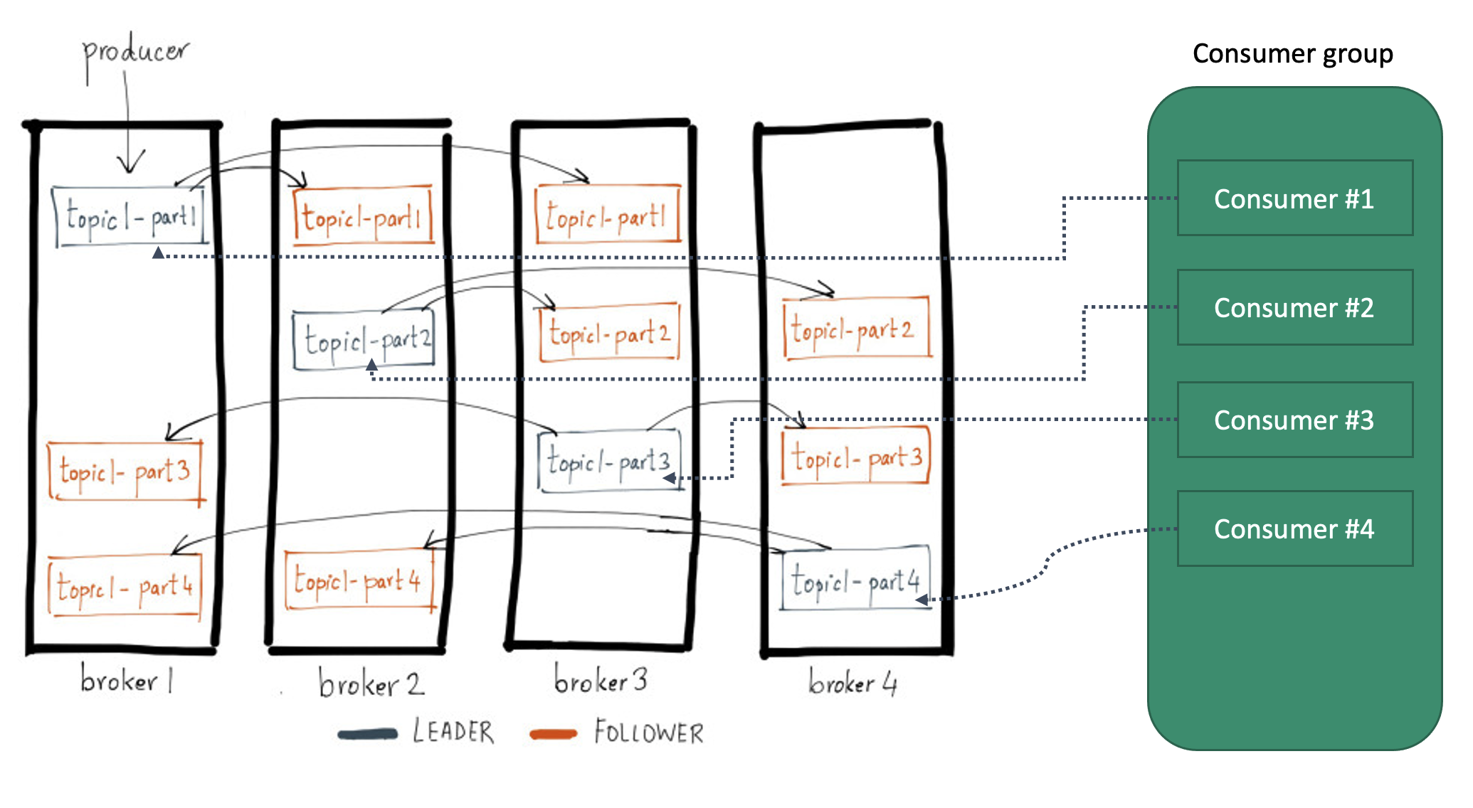 - 옛날 버전의 컨슈머(v<0.9)는 컨슈머 오프셋을 주키퍼(지노드)에 저장 (성능에 문제 있음)