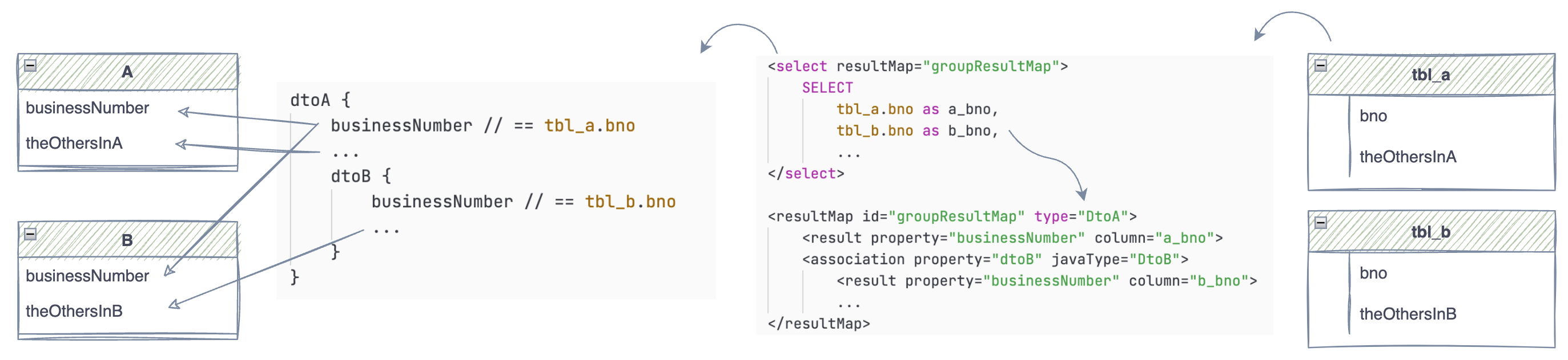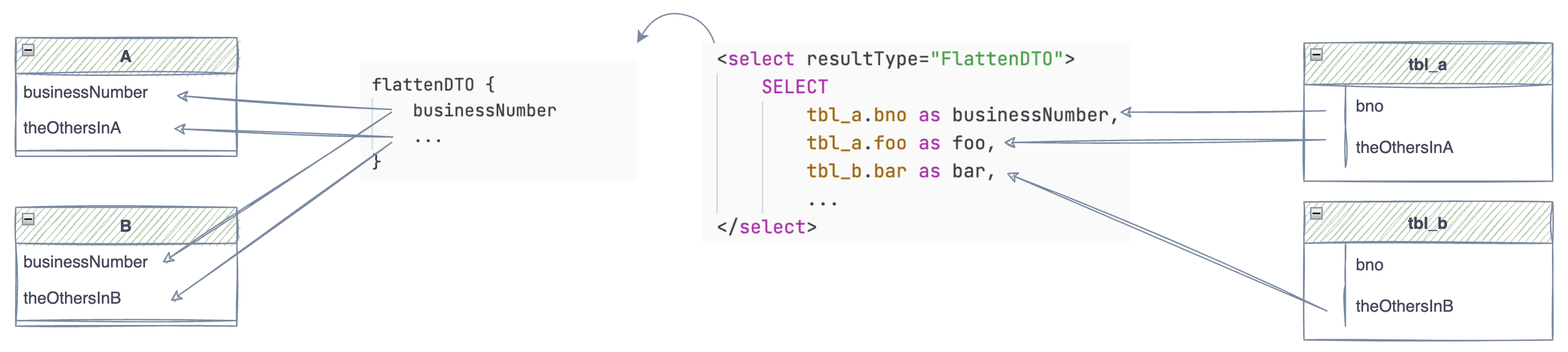 - `` DtoA.businessNumber = tbl_a.bno; DtoB.businessNumber = tbl_b.bno`` 또는 여기서 둘 다 tbl_a.bno로 초기화 할 수는 있지만 이러한 내용이 쿼리에 숨겨져 있다면 더 추적하기 어렵다. (DtoB의 필드는 tbl_b 컬럼에 대응 될 것이라고 예상하기 때문)