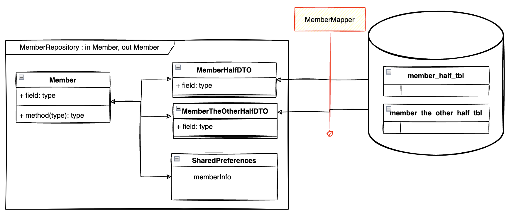 - app 단의 data structure와 DataSource의 data structure가 1:1로 딱 들어맞지 않을 수 있기 때문에 이에 대한 변환 layer가 필요하다. (예제 : Member와 같은 케이스. 또는 상속의 개념이 DB에는 없다 등등.)