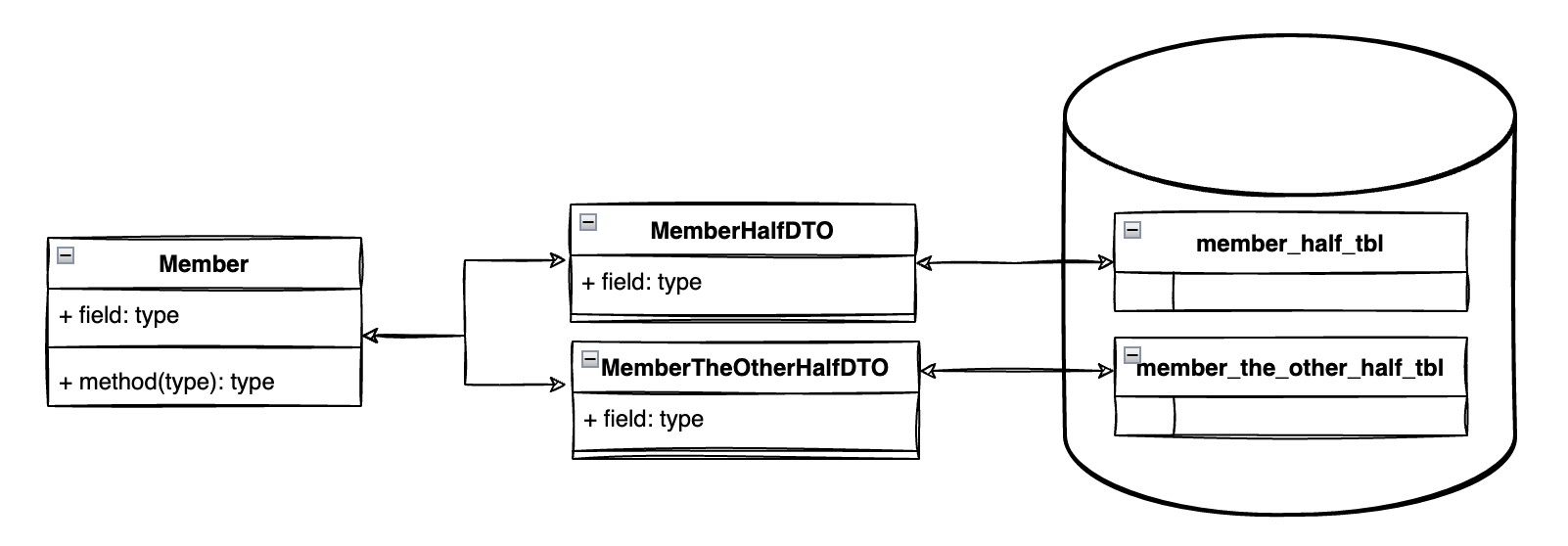- 특히 DTO 없이 Domain Model인 Member를 그대로 사용해 persistence io 하는 경우 자주 보이는 안티패턴이 있는데, [`` 불완전한 member(반쪽) + 불완전한 member(나머지) = 완전한 member``] 를 만드는 케이스다.